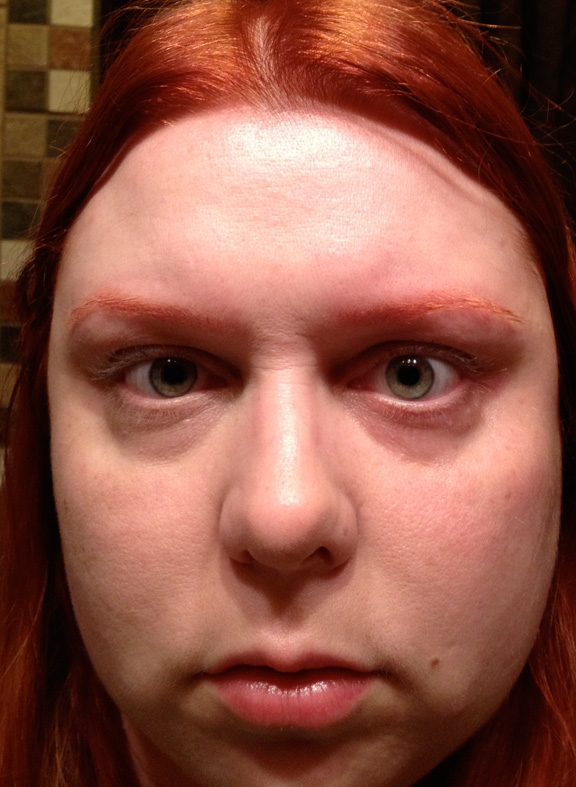 And here's a hilariously cheesy after with the whole face done, before my hair got curled as the curling iron was still heating up. Man I got fatter than I realized and kinda look like a sociopath here. What is that smile? I am going to blame that on it being 6am. Wow the aging going on there...Mid-30s, you are mean.