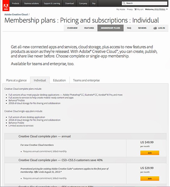 Photo: Plan offerings on Adobe.com, shown through my account page
